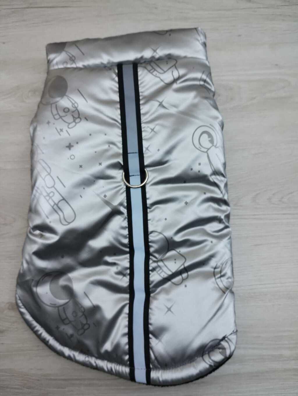 Muy calientito, color plata, con hebilla que le da la función de pechera y tiras reflectantes. Una prenda my completa que tu bendi amará.